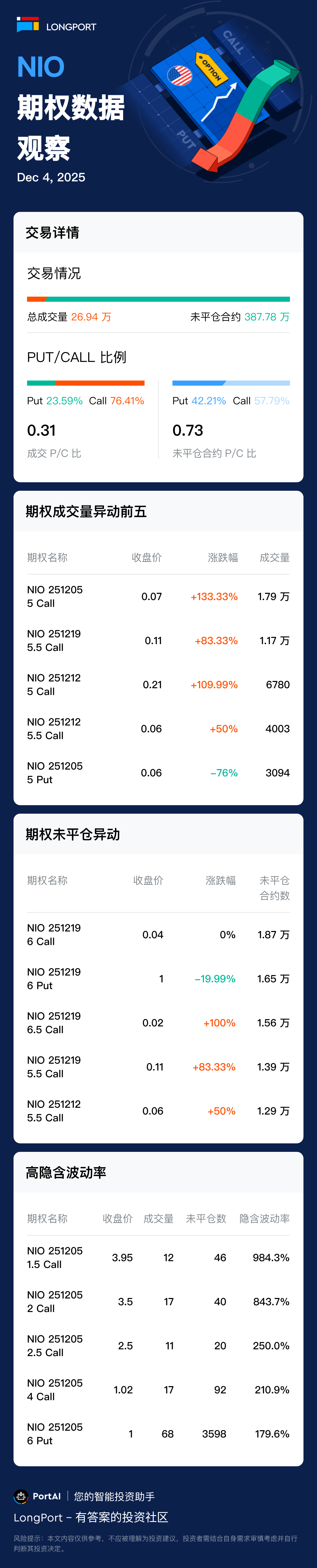 美东时间 12 月 04 日,蔚来汽车期权总成交 269382 张,看涨期权占比 76%,看跌期权占比 23%。