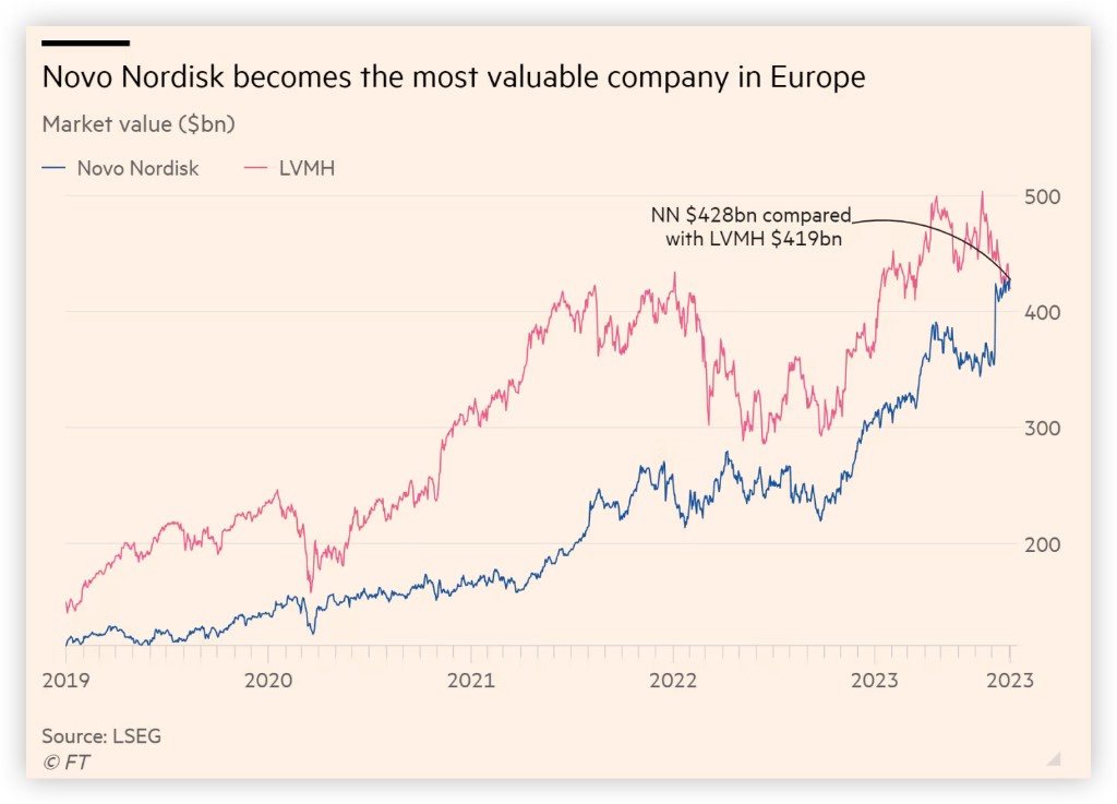 减肥神药 Wegovy 进入英国市场,诺和诺德收盘上涨,超越 LVMH 集团,跻身欧洲市值最高的公司。
