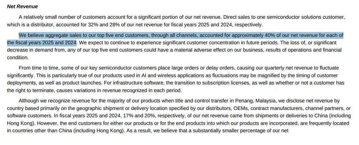 博通的前五大客户占其收入的 40%。48% 的收入来自分销渠道。在 F25 财年,一家分销商占收入的 32%。中国占收入的 17%(76 亿美元)。苹果在 F25 财年贡献了超过 70 亿美元的收入。台积电生产了博通 95% 的外部晶圆。F26 财年的采购承诺仅为 1.06 亿美元。在大家都在争夺台积电产能的情况下,博通仍然是个例外。