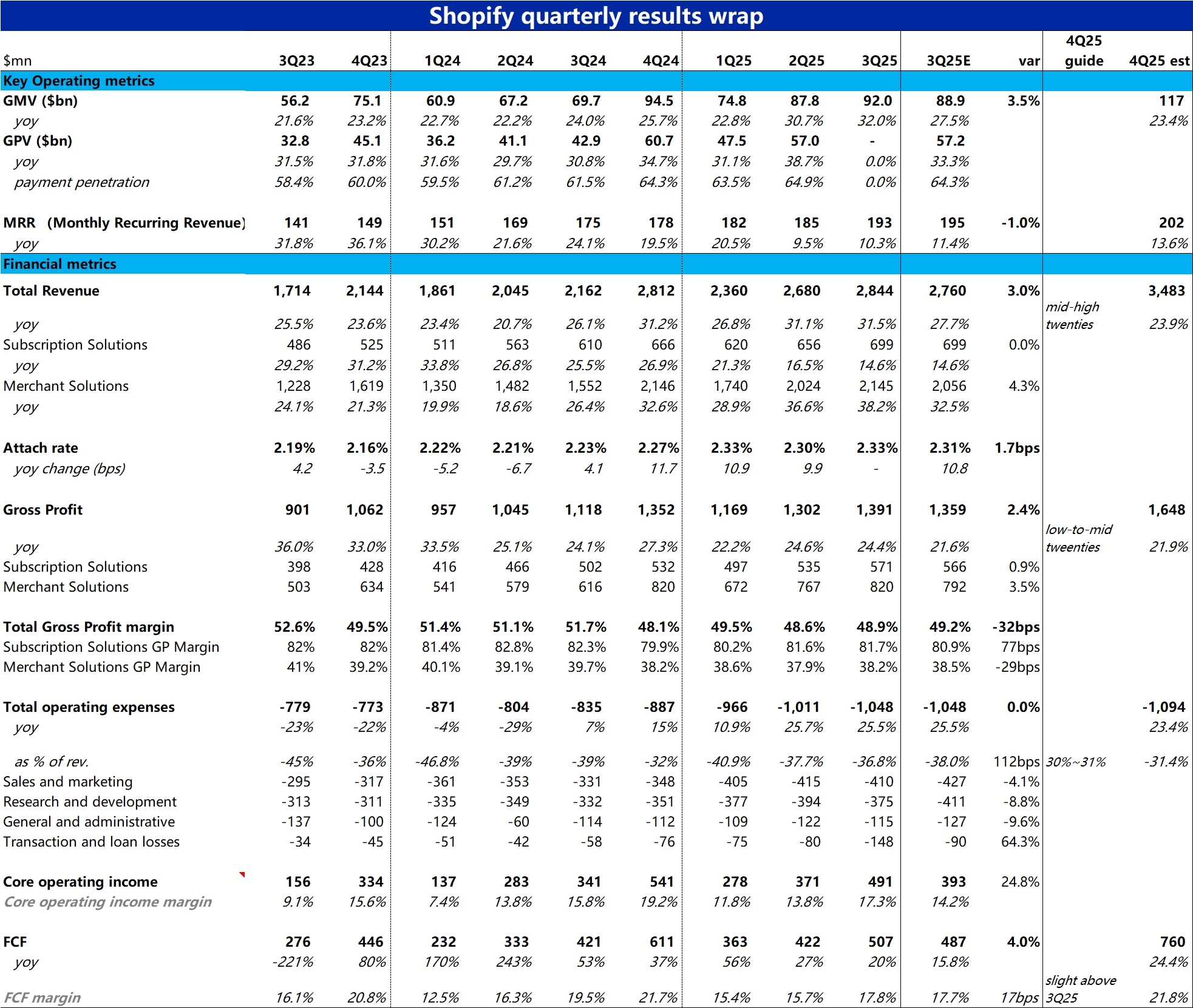 作为目前电商 AI 领域中最受关注的热门标的—Shopify 在 11 月 4 日晚美股盘前,公布了 2025 年 3 季度财报。整体来看,增长表现依然相当强劲,GMV 增速在高基数上继续环比加速,但因毛利率收窄,费用也重回扩展周期,利润率同比收窄幅度扩大,表现并不算好。具体来看:1、强劲 GMV 增长,一切超预期的来源:Shopify 生态内 GMV 本季达 92 亿,同比增长 32%,在上季不...
