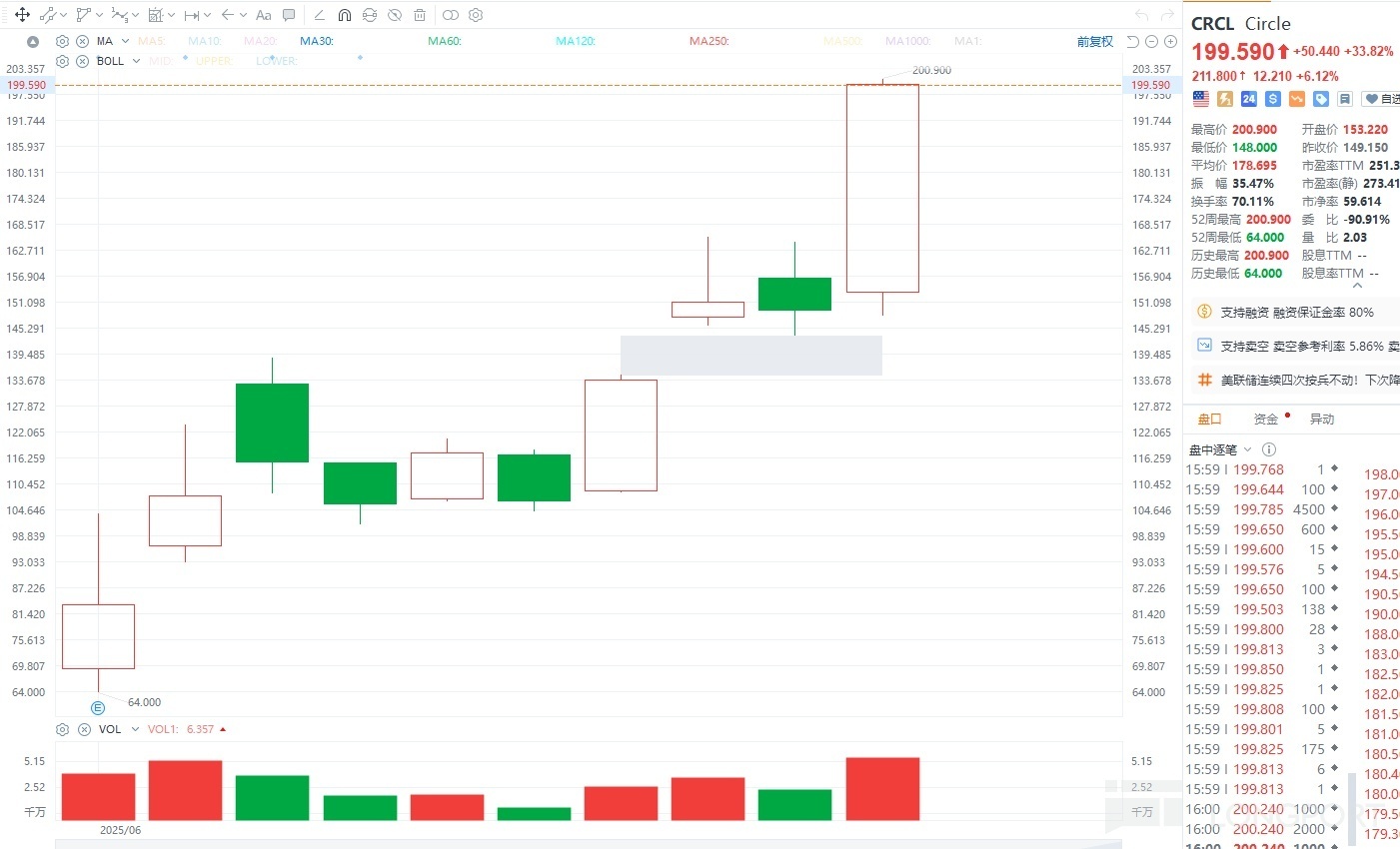 6 月 5 日,Circle 公司的股票 CRCL 上市了,上市后的十多天里,它的股价已经从发行价 31 美元涨到了昨天的最高价 199.59 美元,翻了 6 倍,涨速非常惊人。昨晚,它又上涨 33.82%