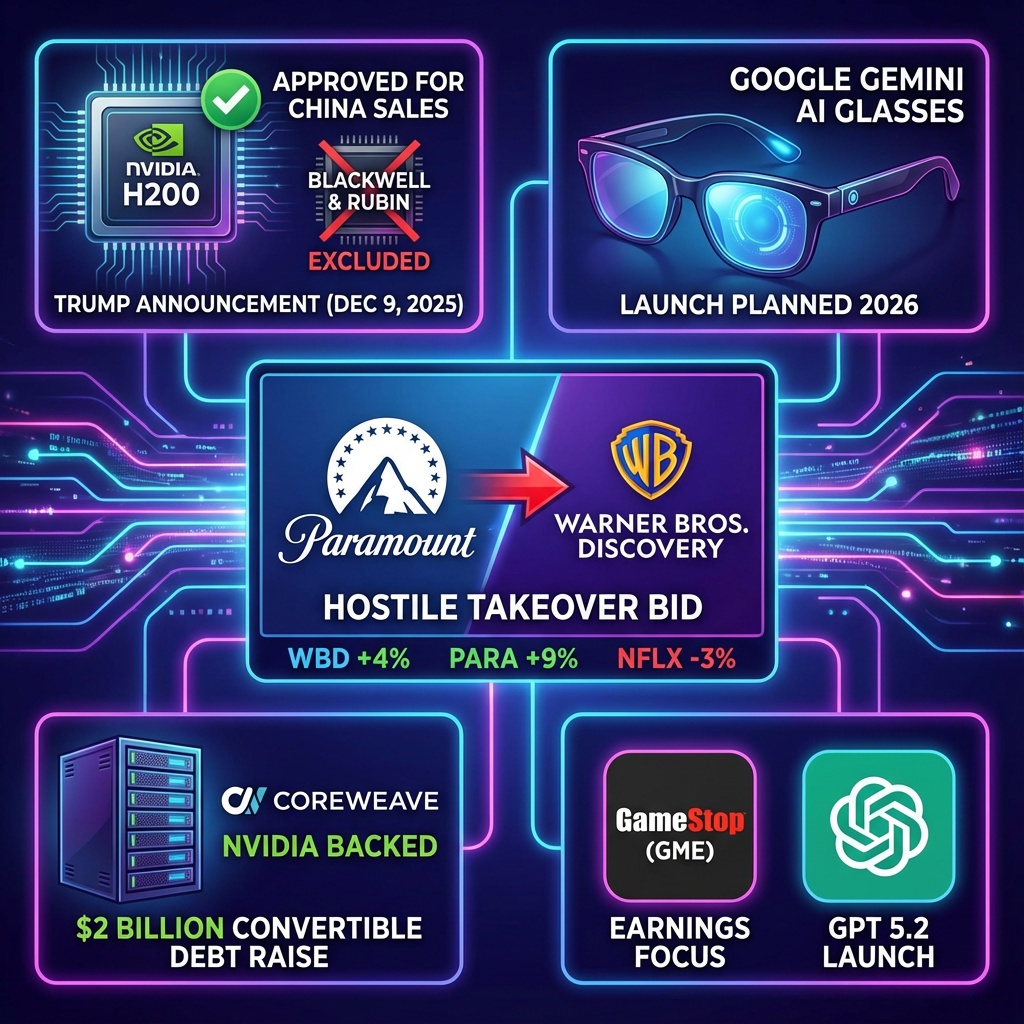 🎬 Hostile takeover bid: Paramount goes after Warner Bros. Discovery — PARA +9%, WBD +4%, NFLX down over 3%.
