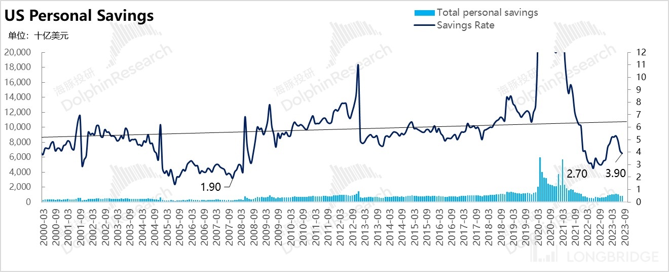 美国上一个居民储蓄率的低点是 08 年美国次贷危机爆发前、居民习惯于借贷消费、整个居民杠杆率都相对较高的时代。