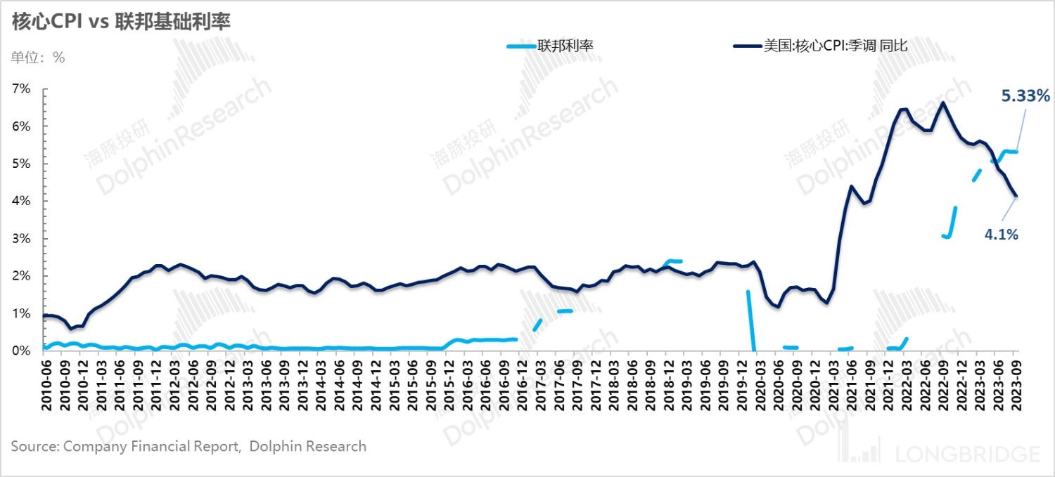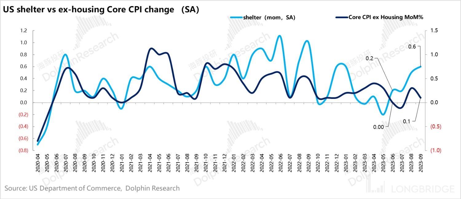1)9 月 CPI 数据看似超预期,但居住成本异常回升带来的超预期,在海豚君看来,并没影响美国利率加息到顶的路径。