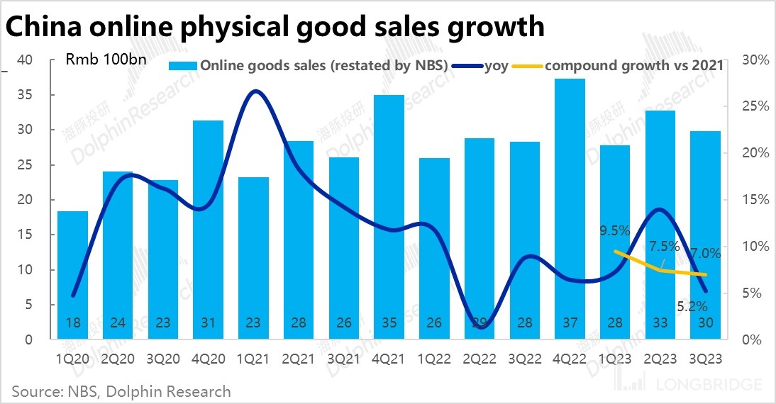 对应到今年三季度上,可以明显看到同比,还是相比 2021 年(踢掉了 2022 年二季度低基数对趋势判断的干扰),三季度的线上实物增长都是在明显放缓的。