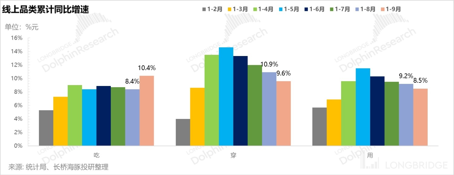 从细分类目来看,除了吃之外,穿和用从累计增长上可以看出 9 月的增速都是在进一步下滑的。