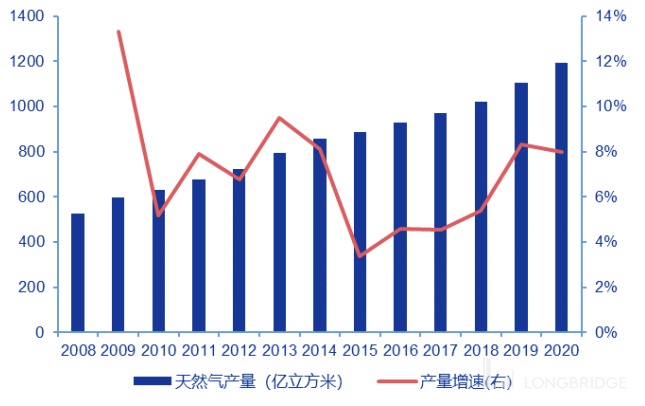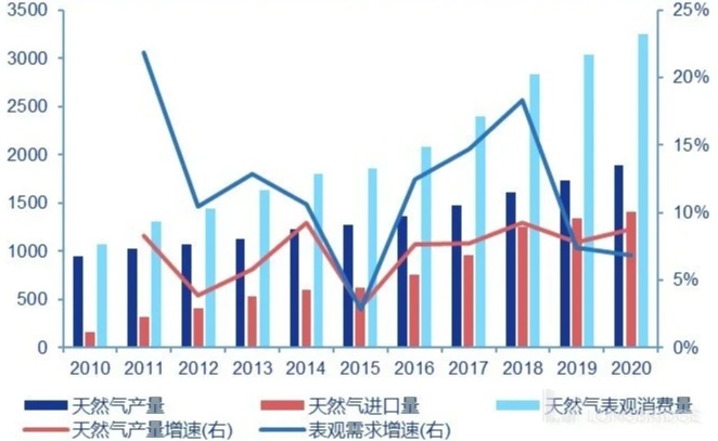 在 “碳中和” 背景下,“煤改气” 进程提速。《报告》指出,结合上半年市场形势初步判断,预计我国 2021 年天然气消费量将达 3650 亿-3700 亿立方米,处于中高速增长区间。