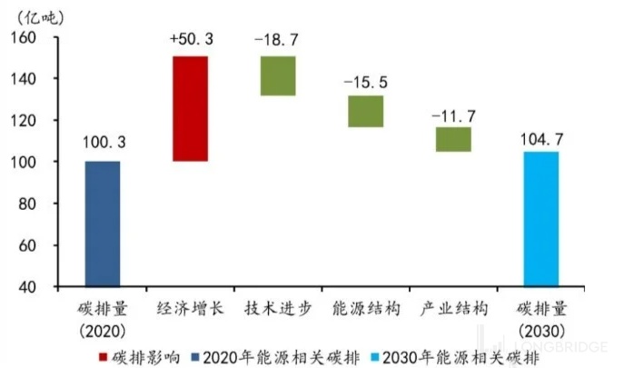 碳达峰路线图:我国需要将碳排峰值控制在 104~110 亿吨之间。在此期间,工业技改、能源结构、产业结构三大因素均衡发力,分别为碳达峰贡献 18.7、15.5 和 11.7 亿吨的减排量;