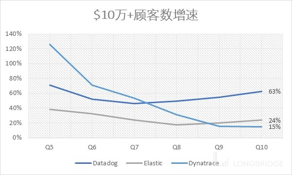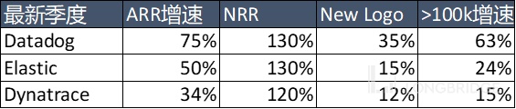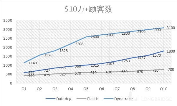 New logo 就是新客户。Datadog 和 Elastic 的总客户数在 15000~17000 家范围。Dynatrace 只做大客户,即他们的所有客户从第一天开始 ARR 都大于 10 万美元,客户数在 3100+ 家。而 Datadog 和 Elastic 的策略都是 Land-and-expand 的销售策略,但只有 10 万美元的客户才能算做有效客户(Datadog 的 10 万 + 客户贡献收入占比超过 80%),因此他们两家都披露 10 万 + 的客户数。
