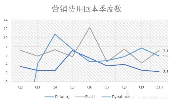 图二则是公司使用的营销费用回本时间(CAC Payback,这个指标好于客户数指标,因为营销工作不仅限于发展 new logo)。定义为:上个季度营销费用/季度环比净增毛利。可见 Datadog 取得同样的毛利增量,只需要 7 个月就能做到营销费用回本。而 Dynatrace 需要 17 个月,而 Elastic 也需要 21 个月。Datadog 的营销效率在相似体量的发展阶段冠绝同业且差距巨大。