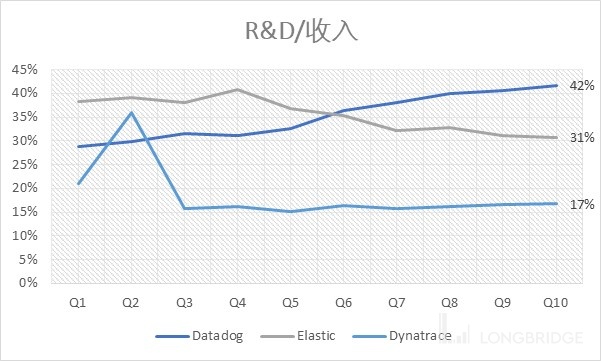 最后我们来看看各家公司对研发投入的力度。Datadog 是在研发投入方面最进取的公司。最新季度的研发开支占当季收入百分比达到 42%,Elastic 只有 31% 而 Dynatrace 更只有 17%。如果用 TTM 过去 12 个月的研发开支对比销售收入,Datadog 数字超过 30%,也同样远高于同业。