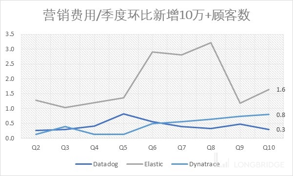 上面两图是 Datadog 对比竞争对手的获客成本。图一可见以新增大客户数来做分母,增加同样数量的$10 万 + 客户,Datadog 付出营销费用成本最低。(定义:上个季度营销费用/新增 10 万 + 客户数)