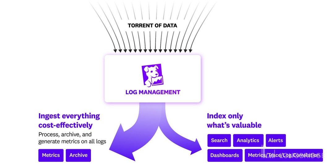 上面两图图一现实的是传统 log management 遇到的取舍窘境:如果如左侧方案,摄取所有 log 并且进行索引将会使成本不堪承受;如果如右侧方案只筛选及索引化一部分 log 就会影响可见度。Datadog 的解决理念是将所有 Log 分成两类,既能低成本地摄入所有的 log,又只索引部分有价值的 log:比如会被用作搜索,分析,警报,Dashboard 以及被用作 log/metric/trace 关联性的这部分 log。
