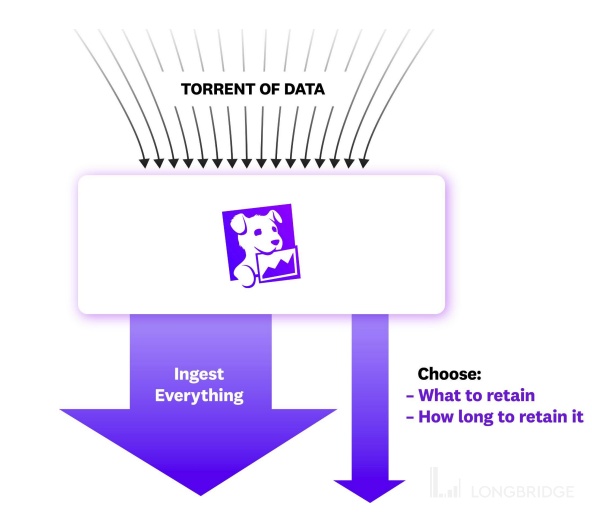 这张图是跟上文讲到 Log management 的图很像。Datadog 帮助客户摄取所有数据,即左边箭头,这部分的按量计价是不提供价值(但占用资源)的,Datadog 降低每单位数据的价格,让这部分定价低于传统 Observability 软件竞争对手。另一部分右边的箭头是客户认为有价值的数据分析功能。这部分则由用户决定哪些要使用,保留,保留时间。这部分因为对客户的价值远高于定价,则可以标较高的单位数据价格。