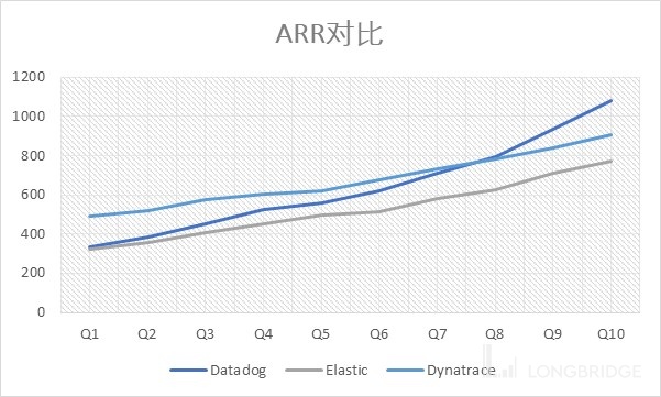 ARR 我用的是季度收入 *4,由于 ARR 不是会计准则要求披露数字,公司一般有自己的一套算法,Elastic 用月度收入 *12,Dynatrace 用汇报期最后一天收入 *365;但是由于月和日收入没人披露,所以我这儿就用了季度收入 *4,来作为超高增速公司的年化收入的 Run-rate。可见比较范围的三家公司都是一个收入级别的公司,但是 Datadog 的增速(70%)显著高于 Elastic(50%)又显著高于 Dynatrace(30%)。