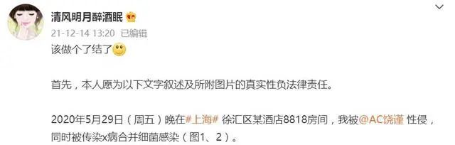 她先是在 12 月 14 日下午发了一条微博,指控 2020 年 5 月 29 日晚在上海徐汇区某酒店 8818 号房间被饶谨 X 侵,同时被传染 X 病合并细菌感染。
