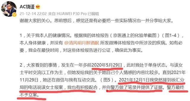 饶谨的这份回应,我们暂且不论这个体检报告的事情,因为饶谨贴出的体检报告是今年 1 月份和 9 月份的,并不能代表去年 5 月 29 日后他的身体状况,但我们获得了一个实锤的信息是,该女士是 2021 年 12 月 1 日突然在上海报案的,在饶谨做了笔录提供证据后,警方最终不予立案。