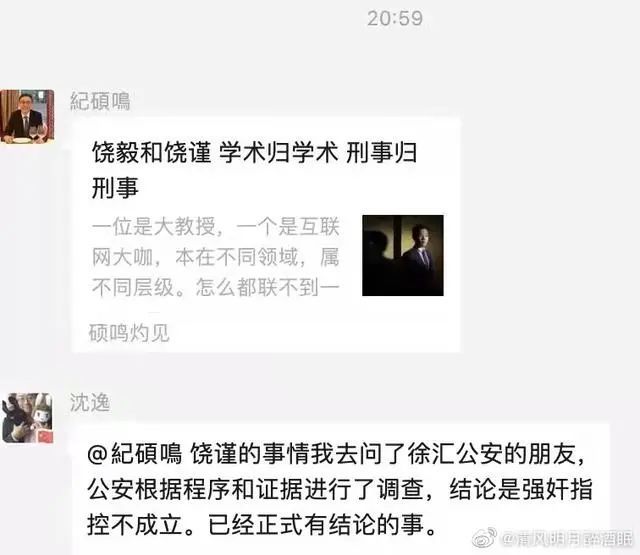 当然,从这张疑似沈教授的聊天截图来看,也再次佐证了饶谨没有撒谎,也即 “上海徐汇警方确实在调查后,认定 X 侵指控不成立”,饶谨纵使再有能量,他也没胆捏造警方调查结论啊。