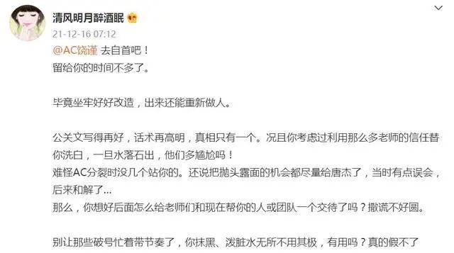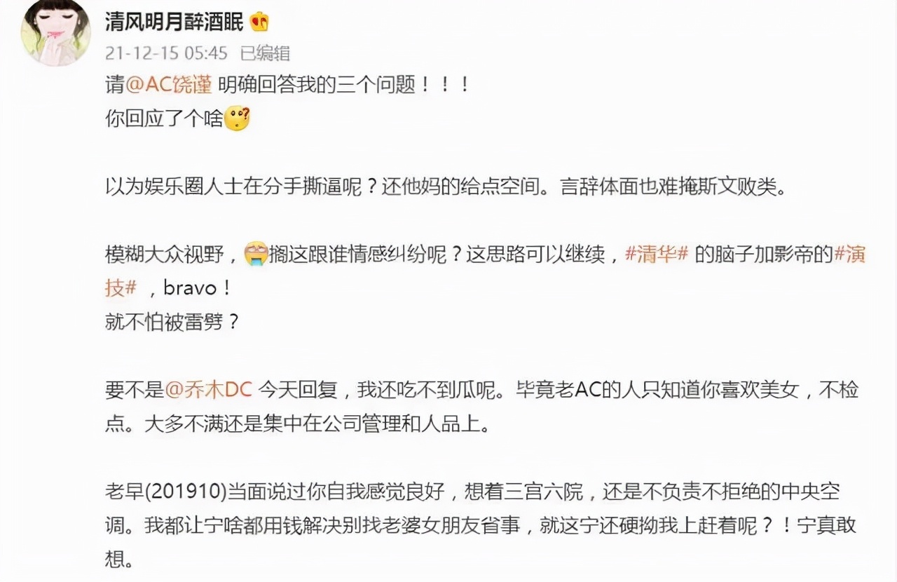 当然,饶谨也不是傻子,作为流量运营实战派的高手,他第一时间在该女子(清风明月醉酒眠)博文下留言 “此信息不实”,并且在稍晚时候,发了长文回应 x 侵指控。