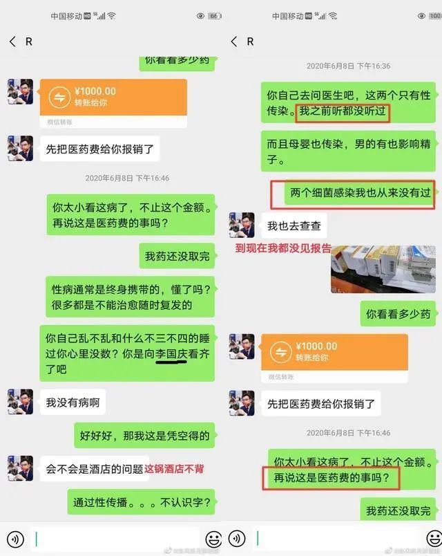再者,发生关系时,男女双方都是单身状态,虽然感染了 X 病很惨,但这与 X 侵的性质不相关,还有,女方提供的一张显示日期为 2020 年 6 月 8 日的聊天截图显示,女方向饶谨抱怨染上了 X 病,并且嫌饶谨转账的 1000 元不够,尤为搞笑的是,女方还把李国庆拿出来类比饶谨,求李国庆心理阴影面积。