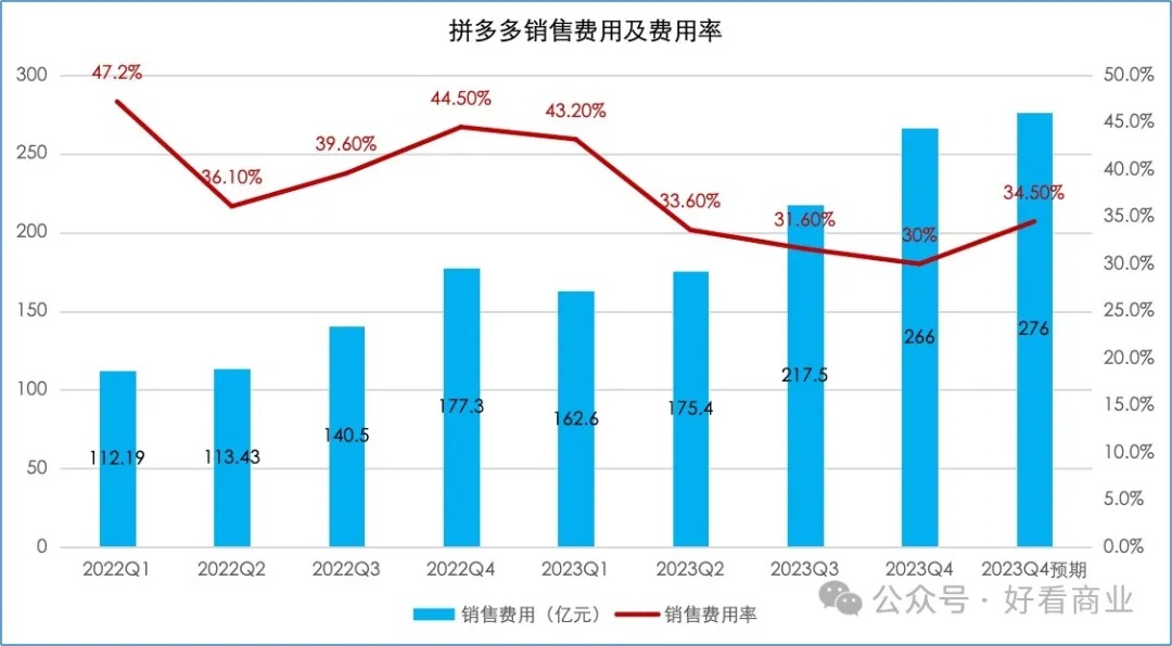 2023 年 Q4,拼多多销售费用 266 亿元,低于预期的 276 亿。虽然环比 Q3 的用 217.5 亿元增加了近 50 亿元,但由于 Q4 营收规模大幅增长,使得消费费用率只有 30%,低于预期的 34.5%,也低于 Q3 的 31.6%。