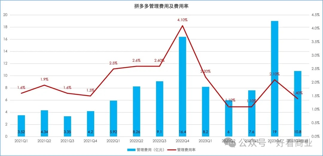 拼多多 Q4 的行政费用为 19 亿元,但如果剔除去年底发放的奖金和期权(期权就达 12 亿元),该季度的行政费用仅 7 亿元;绝对值环比 Q3 还有所降低。