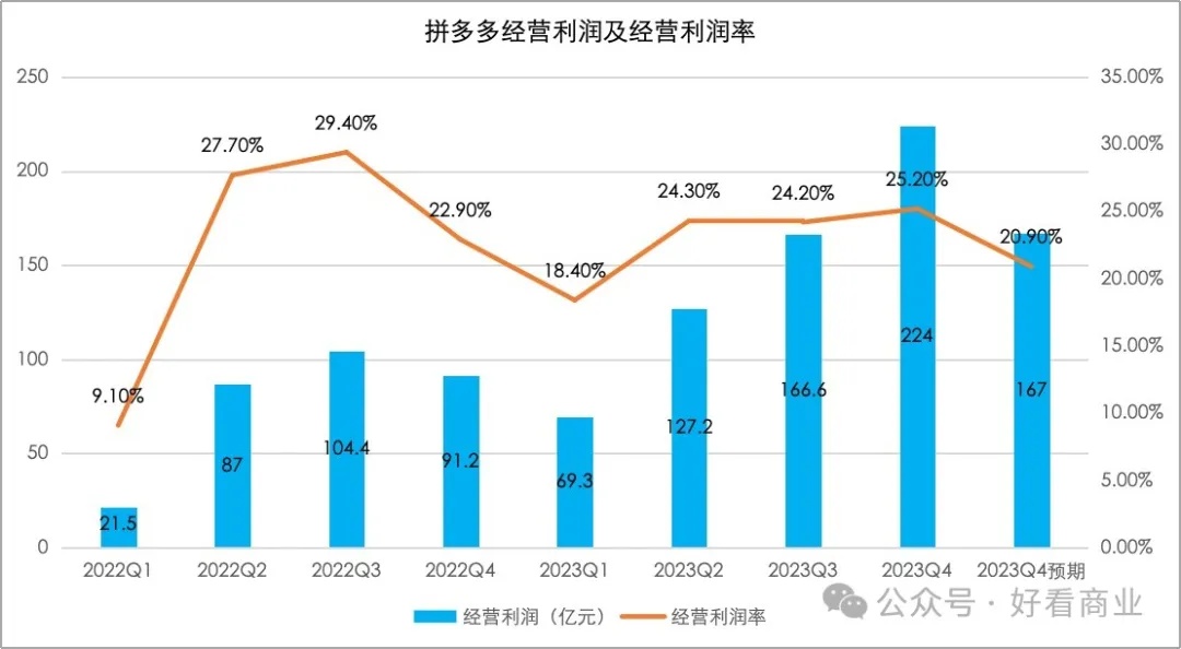 也因此,在去年 Q3 和 Q4,拼多多分别录得 166.6 亿和 224 亿经营利润,Q4 较市场预期高出 57 亿元。