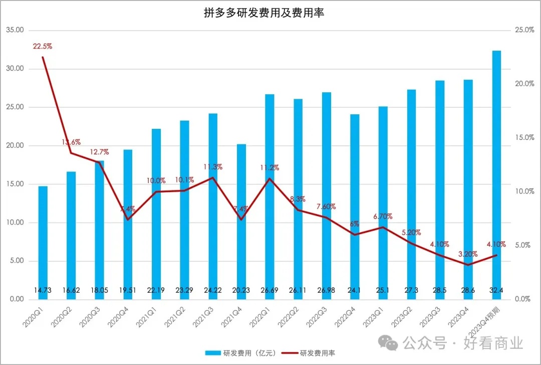 研发费用同样克制。在 Q4,拼多多研发费用 28.6 亿元,与上个季度基本持平,由于营收规模大幅增长,导致该季度研发费用率从 Q3 的 4.1% 降至 3.2%,低于预期的 4.1%。