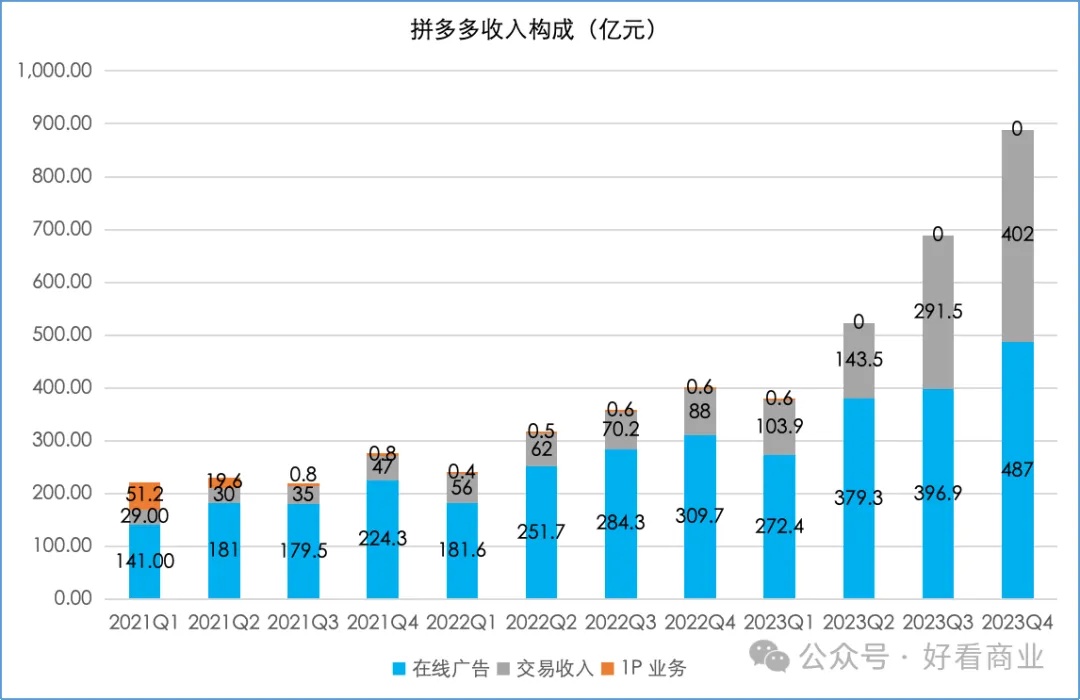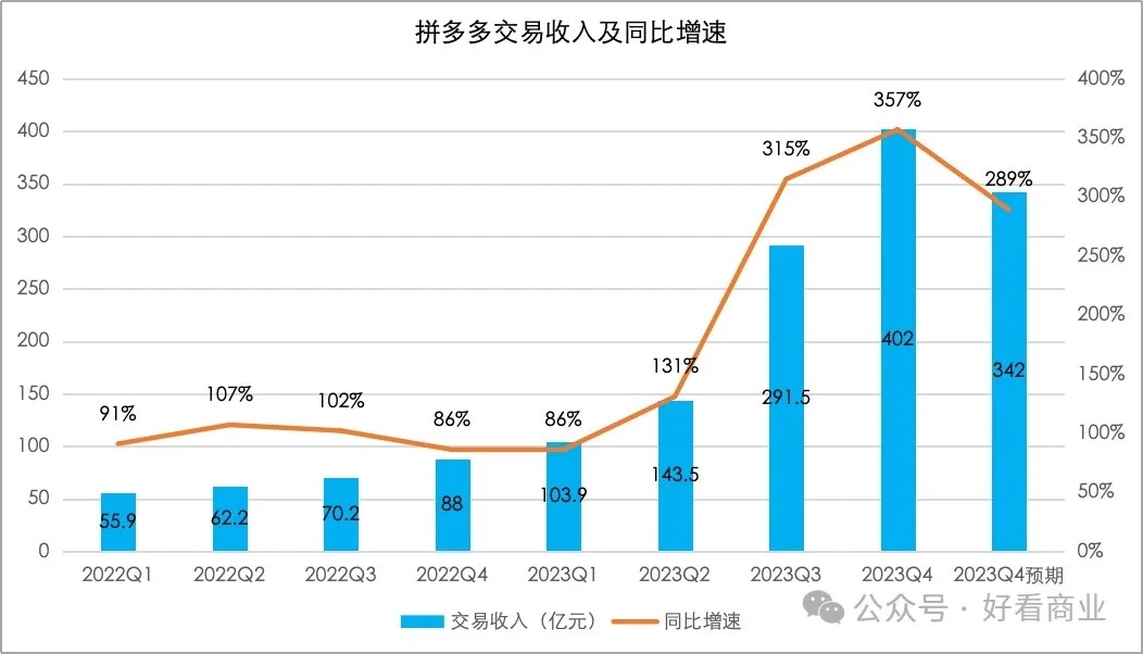 2023 年 Q4,拼多多实现 “交易收入” 402 亿元。假设拼多多国内电商的交易佣金及多多买菜的营收增速与在线广告相仿,也即 57% 左右,那么,Q4 这部分收入规模在 138 亿元上下。