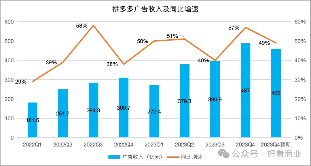受益于国内消费复苏带动,拼多多国内电商业务在 2023 年逐步提速。在财报中,其最大收入来源——“在线广告” 在 2023 年 Q4 同比增长 57%,创过去 5 个季度最快纪录,高于市场预期的 49%,也领先于国内 “在线广告” 领域的一众互联网公司。