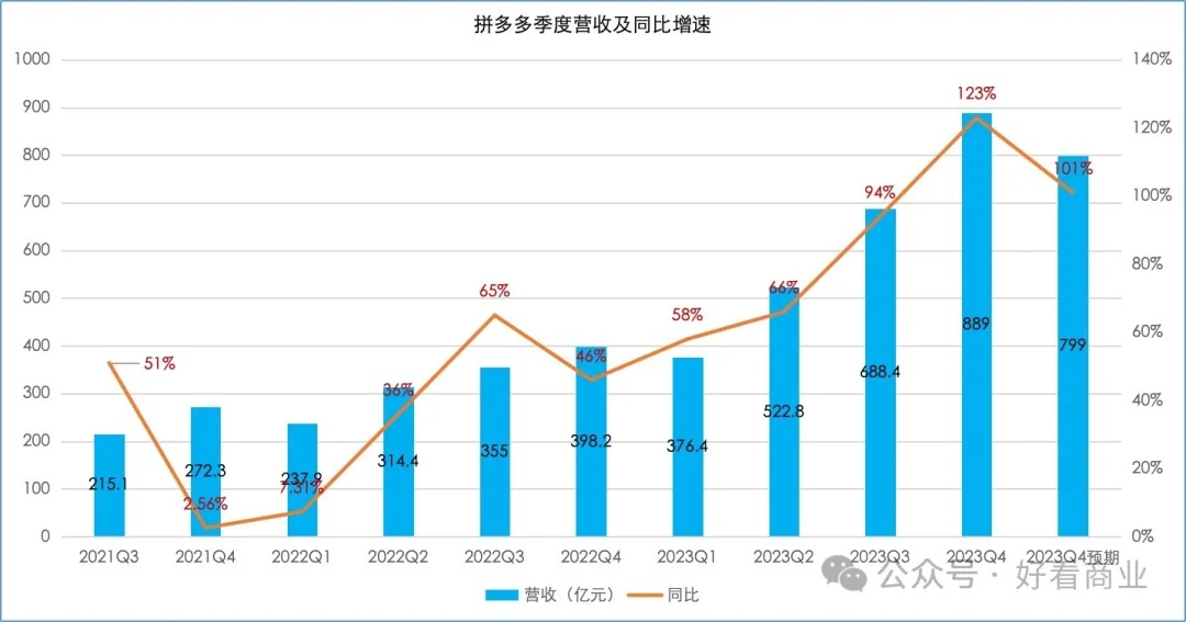 仅在 2023 年 Q4,拼多多集团实现营收 889 亿元,同比增长 123%;净利润 232.8 亿元,同比增长 146%。