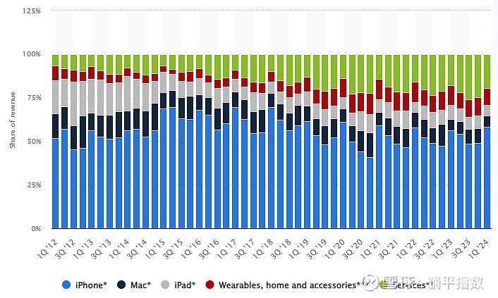 根据公司 2024 年第一财季(2023 年 Q4 业绩),苹果在这个季度实现总营收 1195.8 亿美元,其中,iPhone 营收 697 亿美元,Mac 营收 77.8 亿美元、iPad 营收 70.2 亿美元、可穿戴、居家、周边营收 119.5 亿美元,服务收入 231.2 亿美元。从整体收入的比例分配上,这个收入的多元化看似还不错的。