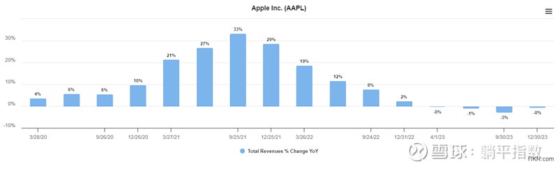这两年,高收入国家移动互联网的渗透基本实现,智能手机的内卷竞争更加激烈,苹果的业务陷入了增长缓慢甚至是无增长的境地,除了 2023 年第四季度,自 2022 年底以来,公司从未实现过正的营收增长率,这对于一家享受成长股估值的科技公司来说,是一个非常危险的信号。