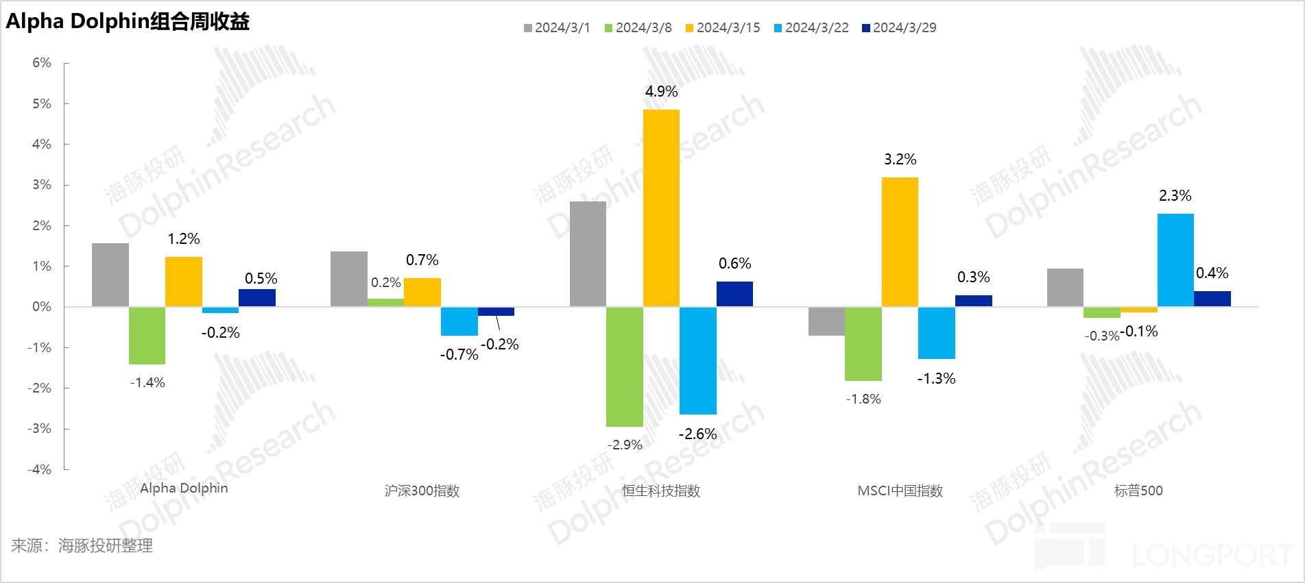 3 月 29 日周,Alpha Dolphin 虚拟组合无调仓。当周结束,组合收益小涨 0.5%,与标普 500(+0.4%)以及恒生科技(+0.5%)基本没有差距,稍强于 MSCI 中国(+0.3%)与沪深 300(-0.2%)。