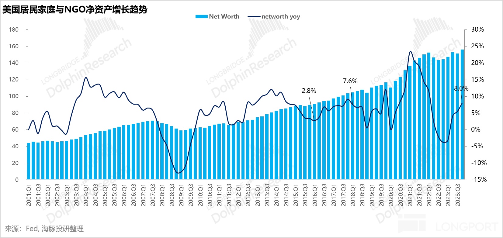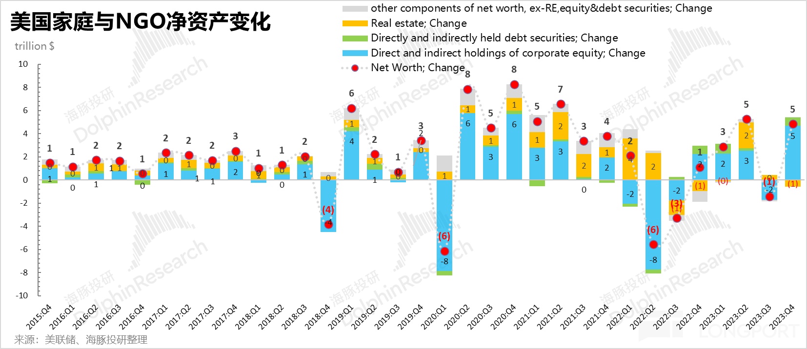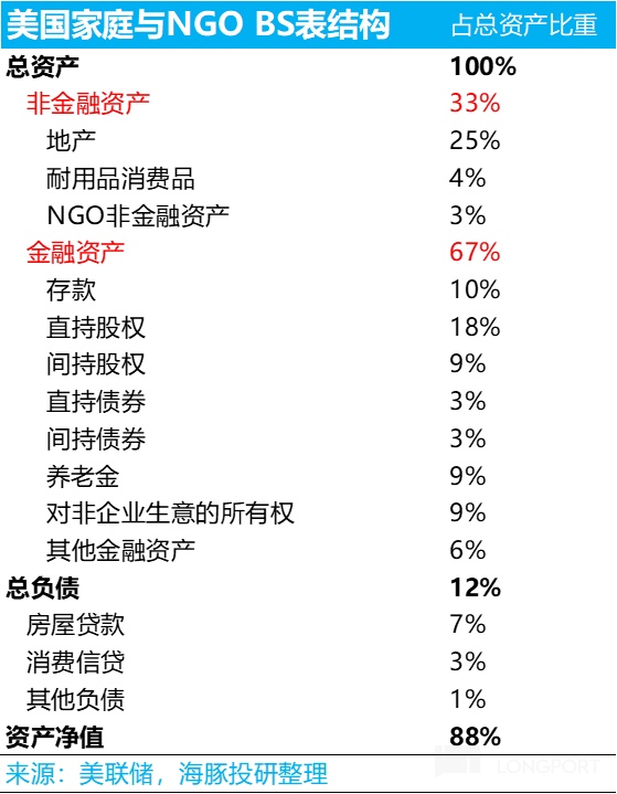 以去年四季度为例,美国的居民资产负债结构中,居民的非金融资产主要是房产,大概占到了总资产的 25%;这部分在高息的压制之下,无升值效应,过去一年的资产额基本没动。