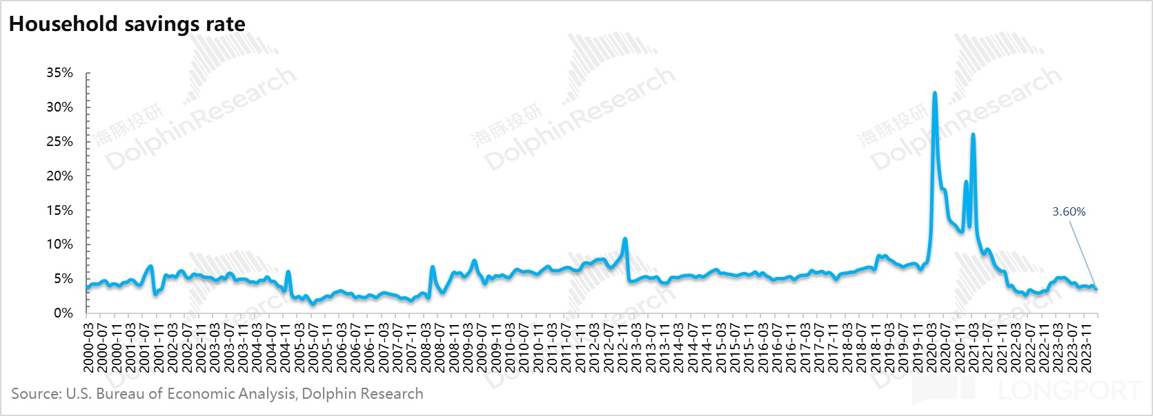 在《企业接力居民撑经济,美国降息不会快》中,海豚君曾表达过信用卡违约率和坏账转化率提升,需要关注居民消费中超额储蓄基本耗光的问题,似乎到 2 月,这个问题没有出现。