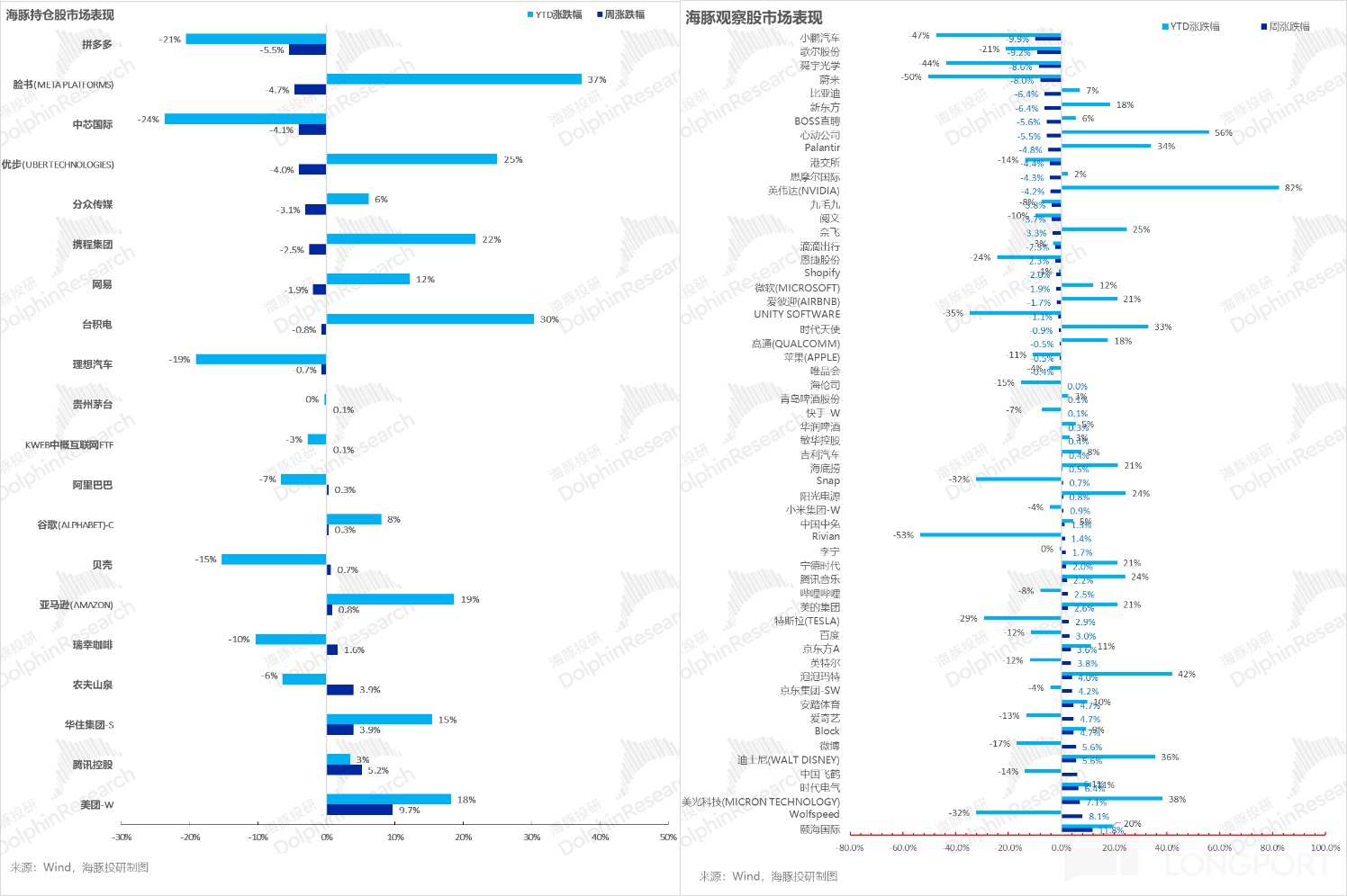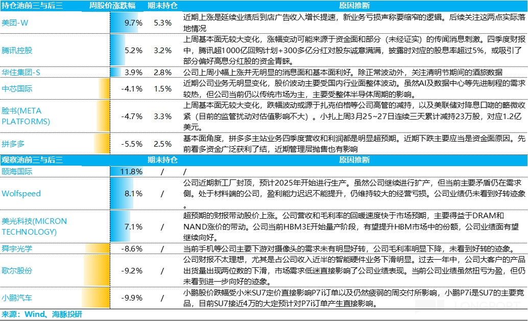 对于海豚君持仓池和关注池中,上周主要涨、跌幅比较大的公司以及可能原因,海豚君分析如下: