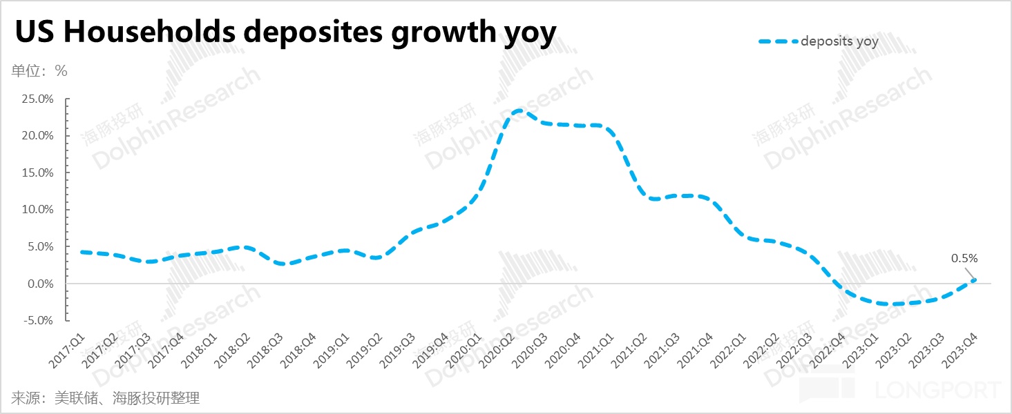 首先,由于居民当期的收入都消费了,基本没留多少给自己存款。居民当期收支中流入到自己存款账户的钱越来越少。这个结果体现在居民的资产负债表上,就是居民的储蓄(deposits)同比基本零增长,甚至是逐步减少的。