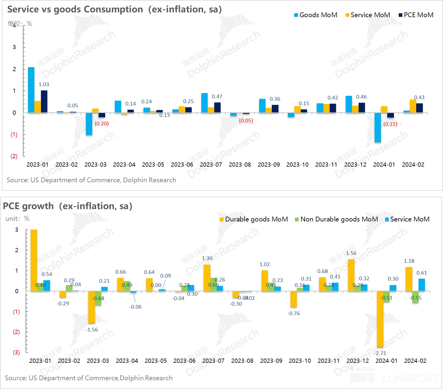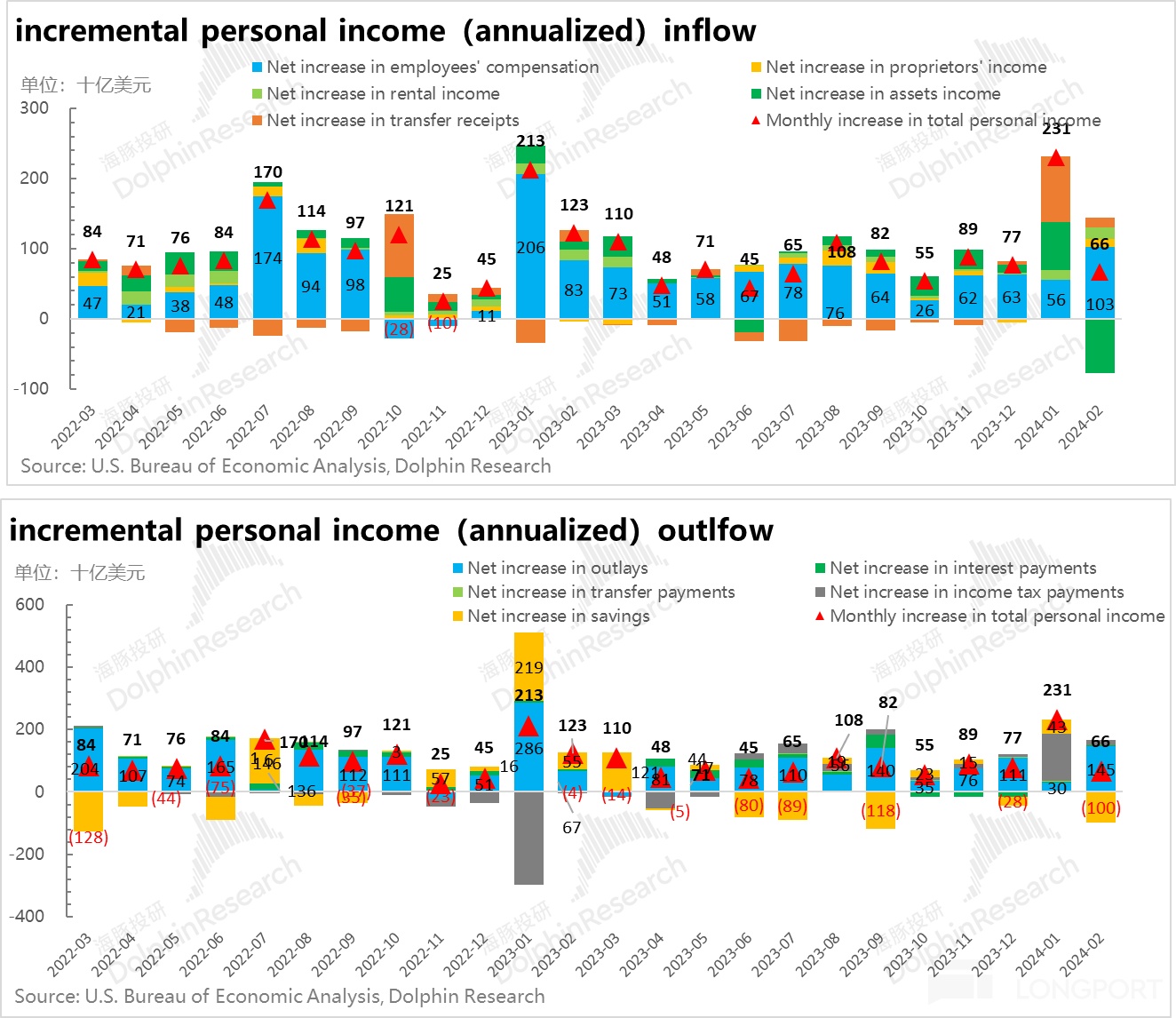 从今天开始,就进入美国 3 月宏观数据的公布期,海豚君会持续观察。至少在目前美国经济基本面仍然强劲的情况下,而且后续还有降息加持的情况下,海豚君不会轻易去相信美联储所说的——1、2 月份的再通胀只是泄通胀路上一个小波动,后面整体还会是泄通胀,且今年还会一路掉到 2.6% 的节奏。