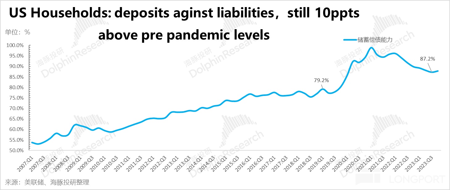 但即使存款余额不增长,美国居民的偿付能力(也就是存款余额相对于居民总负债的比例关系)仍然远远在疫情前的水准之上,高出 10 个百分点上下。