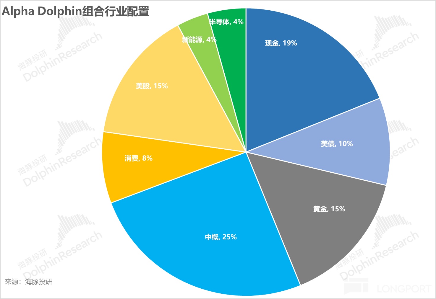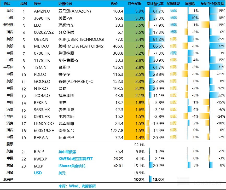 Alpha Dolphin 虚拟组合共计持仓 20 只个股与权益型 ETF,其中标配 6 只,其余权益资产为低配,剩余为黄金和美债和美元现金。