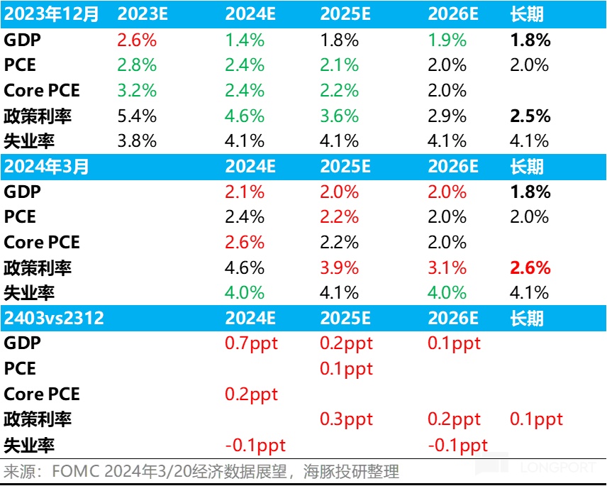 但在美联储在最新的经济预测中,美联储明显是不认为今年核心 PCE 是在 3.5% 上下,而是认为在 2.6% 上下,且之后两年逐步稳定下降到 2%。这样的判断给出降息三次顺理成章。
