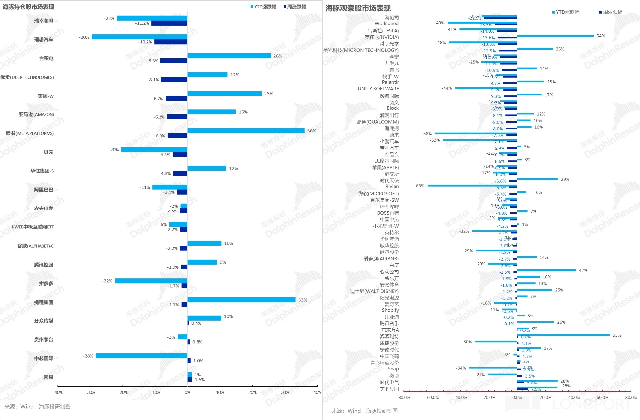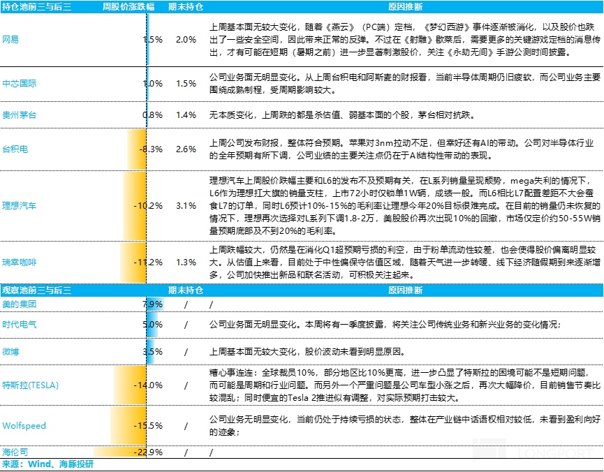 对于海豚君持仓池和关注池中,上周主要涨、跌幅比较大的公司以及可能原因,海豚君分析如下: