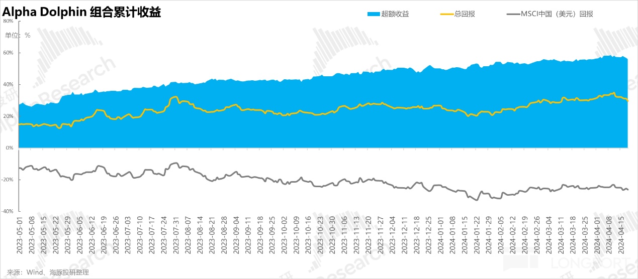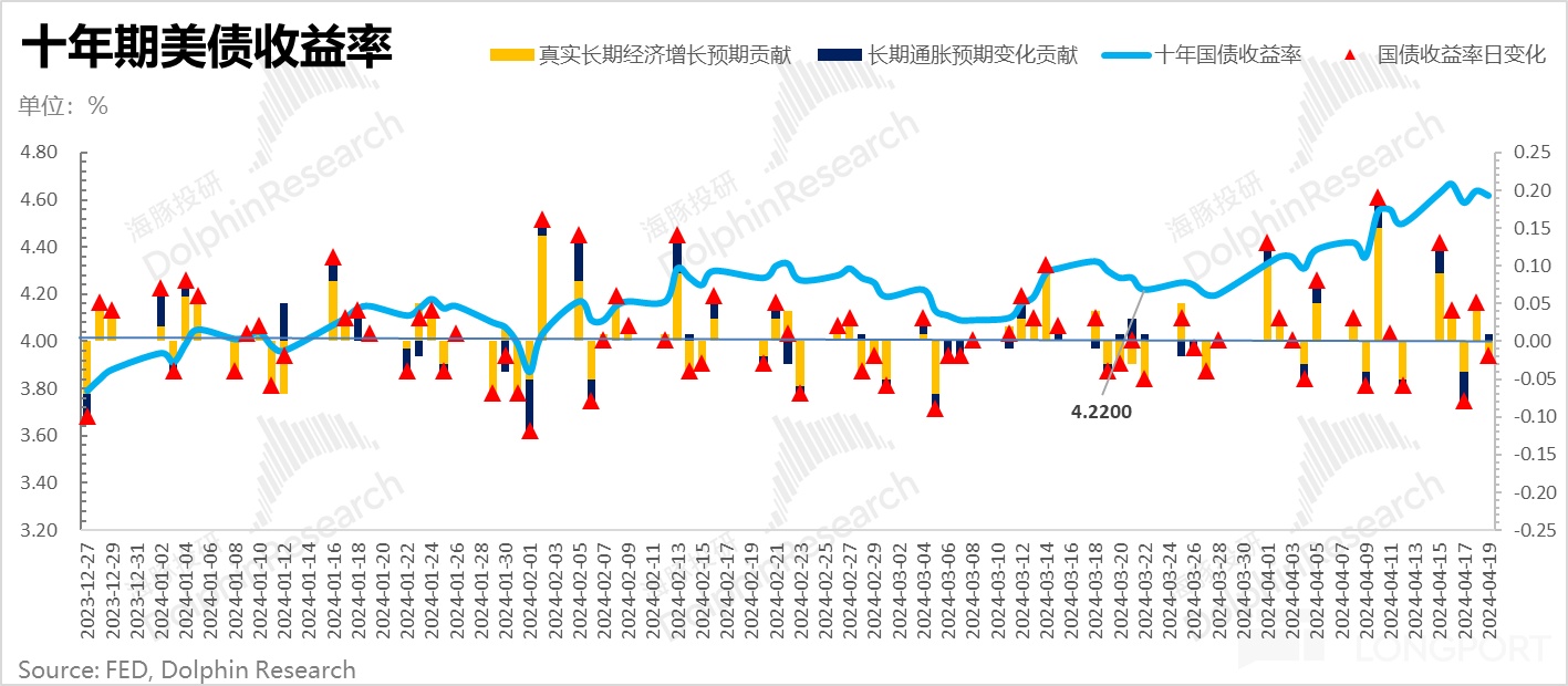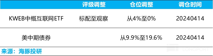 因国内宏观基本面再次转弱,同时外围流动性和估值压力都在变高,因此 4 月 19 日周,Alpha Dolphin 虚拟组合调出 Beta 收益型指数 KWEB,但认为当前超过 4.6% 的美债收益率已经充分定价了不降息的风险,海豚君加仓了美债。