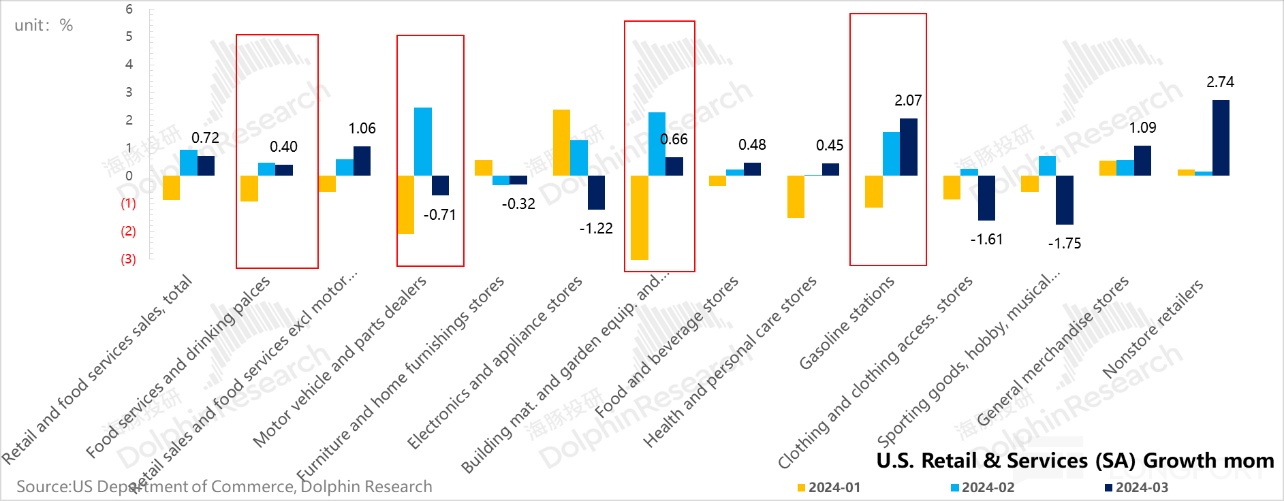 换句话说,3 月的社零表明, 虽然高息环境下,消费者在支出结构上,减少了需要搭配贷款来购买的可选商品,而把更多的支出放到了线上和必选当中。