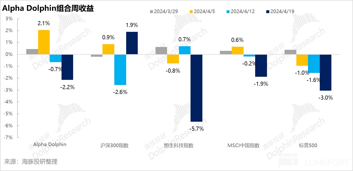 当周结束,组合收益收跌 2.2%,虽然跌幅较大,但仍然跑赢了除沪深 300(+1.9%)和 MSCI 中国(-1.9%)之外的多数指数,包括恒生科技(-5.7%)、标普 500(-3%)。