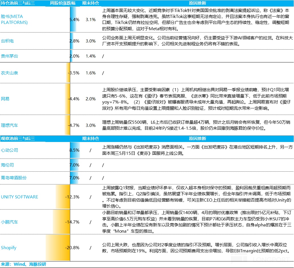 对于海豚君持仓池和关注池中,上周主要涨、跌幅比较大的公司以及可能原因,海豚君分析如下: