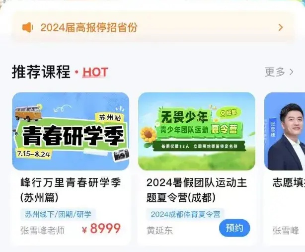 比如,面向 2025 年、2026 年毕业的高中生,张雪峰上线了售价 8999 元的 “峰行万里青春研学季” 活动,包括与张雪峰面对面交流,探访 985 名校、苏州园林等旅游项目。