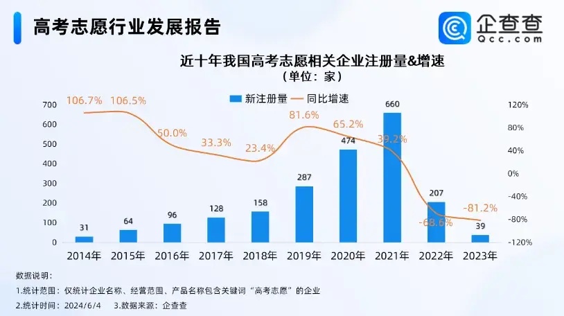 企查查数据显示,2014 年~2021 年,中国高考志愿相关企业注册量从 31 家,逐年递增至 660 家,增速保持在 30%~90% 之间。2024 年前五个月,中国注册 21 家高考志愿相关企业,已超 2023 年全年注册量的一半。