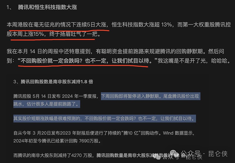 最近的一次现场教学就是腾讯 5 月 14 日发布一季报表前的一个月静默期,很多朋友按照惯例提前卖出,等待静默期股价下跌后再买回。我当时还反问:“不回购股价就一定会跌吗?也不一定,让我们拭目以待”
